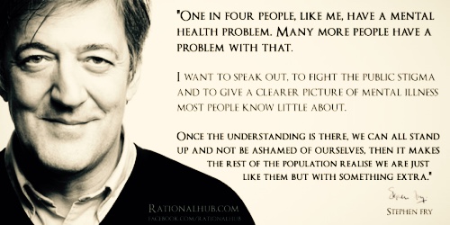 Stephen Fry is a British actor, writer, comedian, TV presenter, narrator, raconteur, poet and philosopher. He also famously has bipolar disorder. Through his work he weaves humor, razor sharp intellect, and a refreshingly open attitude about his own life. The result is a tapestry of eminently quotable wit and wisdom. Below, his engaging and illuminating TV documentary Secret Life Of The Manic Depressive. Below that, I’ve collected a few of my favorite Fry quotations on bipolarity and life.
