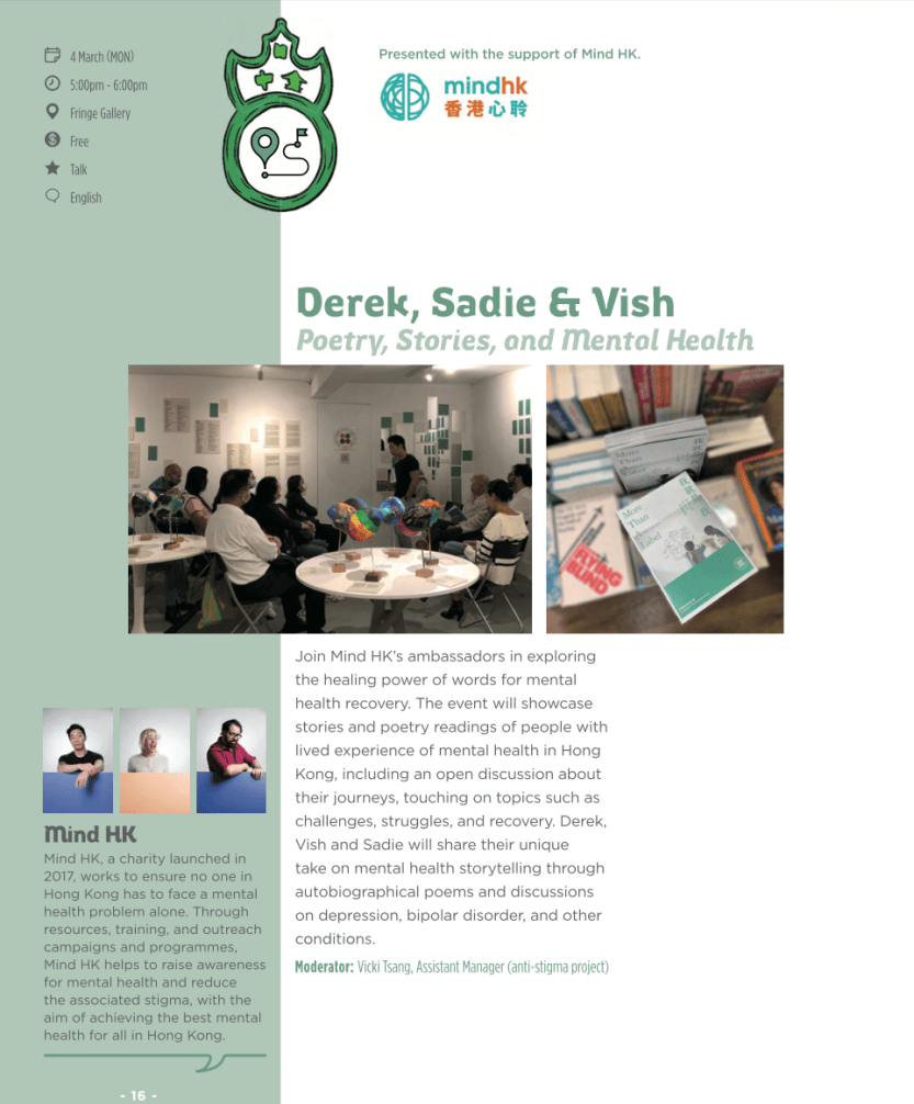 Our founder and Mind HK ambassador Sadie Kaye and two other poets with bipolar disorder will be taking part at a Mind HK organised poetry event on Monday evening (4 March) that is part of the 2024 Hong Kong International Literary Festival. This means our monthly support group at Starbucks will not be happening this month. Instead, we will squeeze in another in-person meeting mid-March. While most members already know this via our Whatsapp group chat, if you are a first-timer planning to show up on Monday, please contact us so we can get in touch with details of our next meeting!